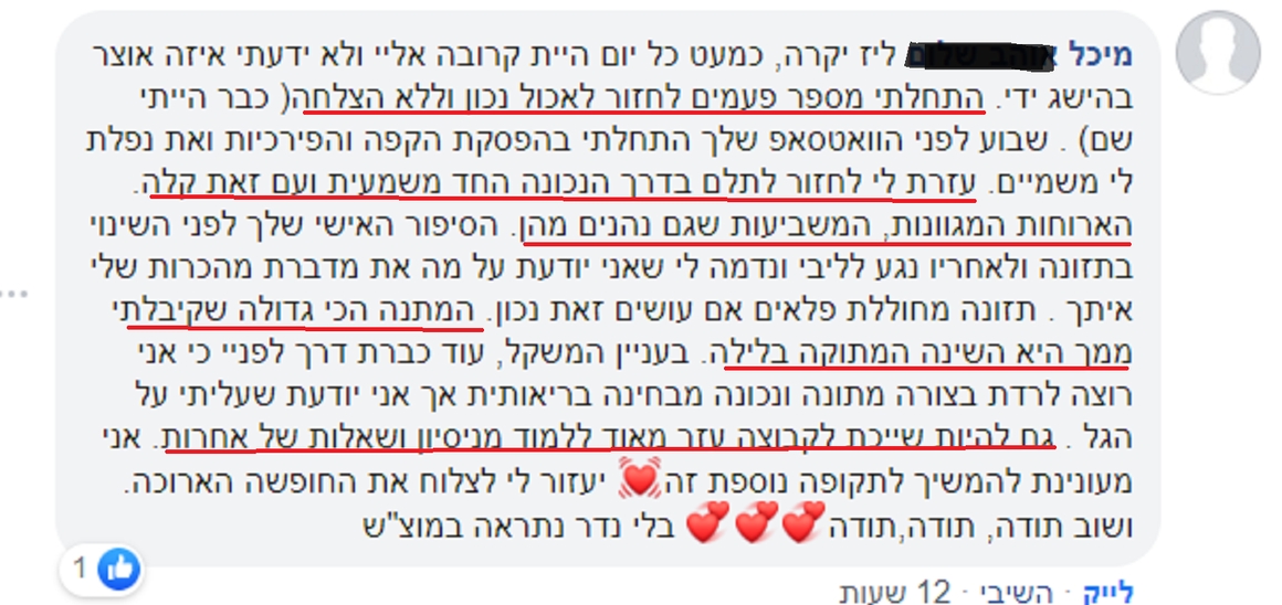 "הדבר החשוב שלקחתי מהתהליך מעבר לריבוי שתיית המים,זו השליטה על האוכל בערבים / בלילות."