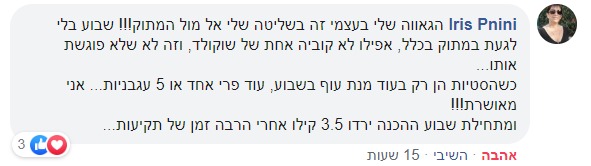 "כשפניתי לליז הייתי סקפטית אם היא תצליח במקום שרבים אחרים לא צלחו והופתעתי לטובה...המתנה הכי גדולה שקיבלתי זו היכולת להקשיב לגוף שלי ולמה שטוב עבורו... מברכת על כל יום שזכיתי להכיר את ליז ואת התוכנית המדהימה שלה"
